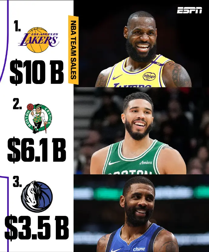 在过去几年中,已经先后有三支NBA球队被出售,分别是独行侠、凯尔特人、湖人。独行侠老板马克-库班在2023年以35亿的美元价格出售了独行侠队多数股权。2024年,凯尔特人的老板维克-格罗斯贝克也以61亿美元的价格出售凯尔特人队。