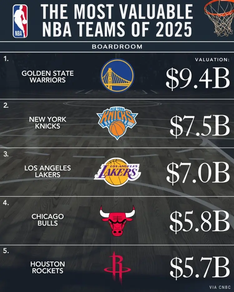 在美国体育商业媒体Boardroom最近更新的NBA球队市值排行榜中,湖人同样估值为70亿美元,排名第三,不及勇士和尼克斯。勇士则以94亿美元高居联盟第一,尼克斯估值为75亿美元排名第二。